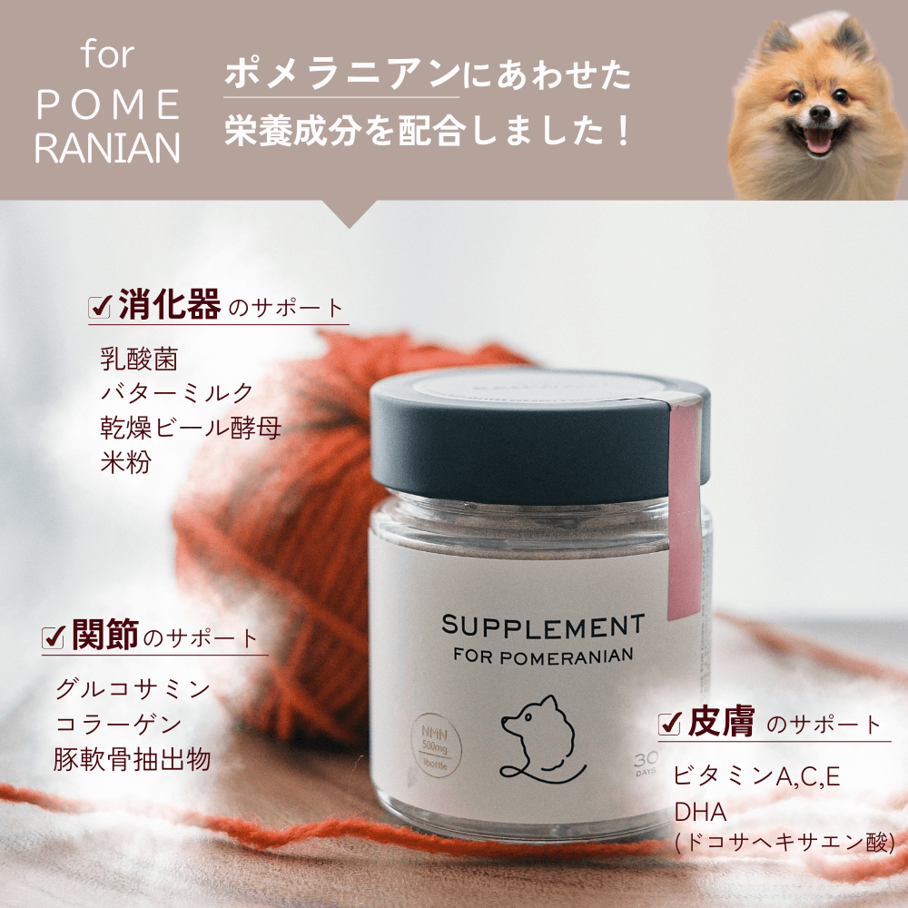 なりやすい病気や、しやすいケガが犬種によって違うからこそ、犬種にあわせた栄養補給をしてあげたい。ポメラニアンに合わせて、消化器の健康・関節の健康・皮膚の健康をサポートします。