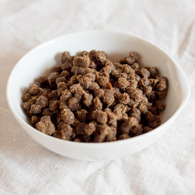 コーティング剤等を使わず無添加で作っているため、袋内で粒同士がくっつきます。開封後は、かるくもみほぐしてから与えてください。